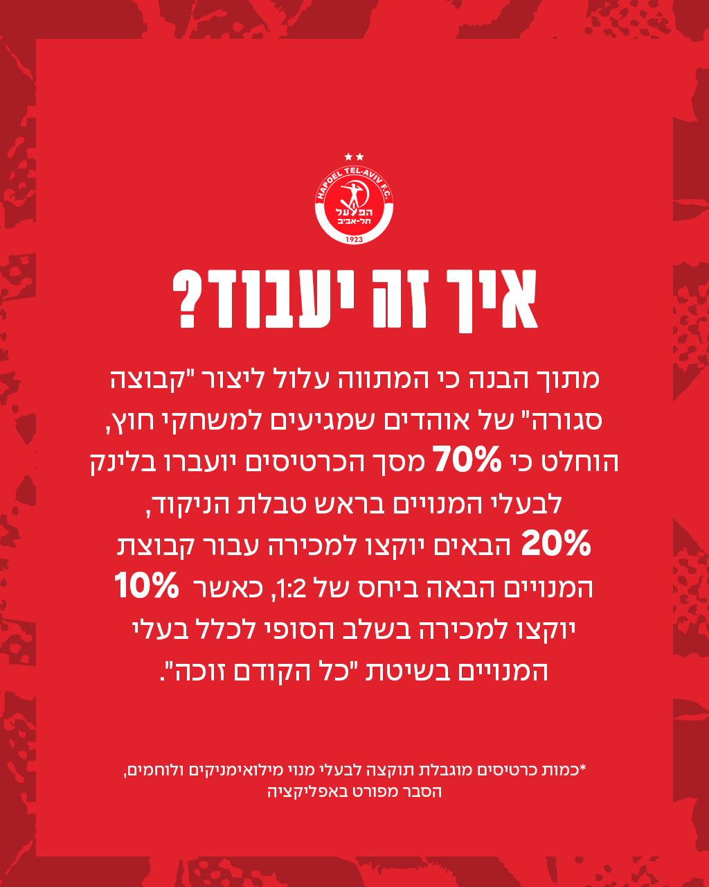 70% מסך הכרטיסים יועברו בלינק ייעודי לבעלי המנויים בראש טבלת הניקוד לרכישה בתוך פרק זמן מוקצב,